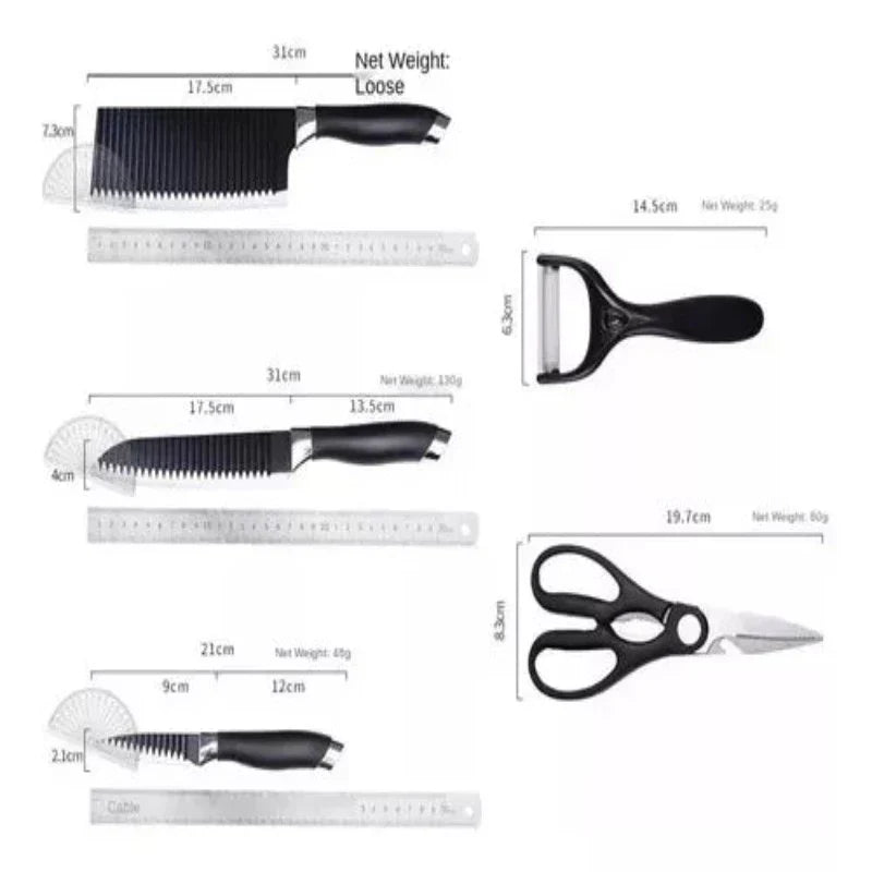 Variedad de Cuchillos: El juego incluye un cuchillo de chef de 8" (33 cm), un cuchillo de trinchar de 8" (33 cm), un cuchillo pequeño de 3.5" (20 cm), un cuchillo de cocina de 8" (33 cm), unas tijeras de cocina y un pelador de cerámica de 6" (14.5 cm).