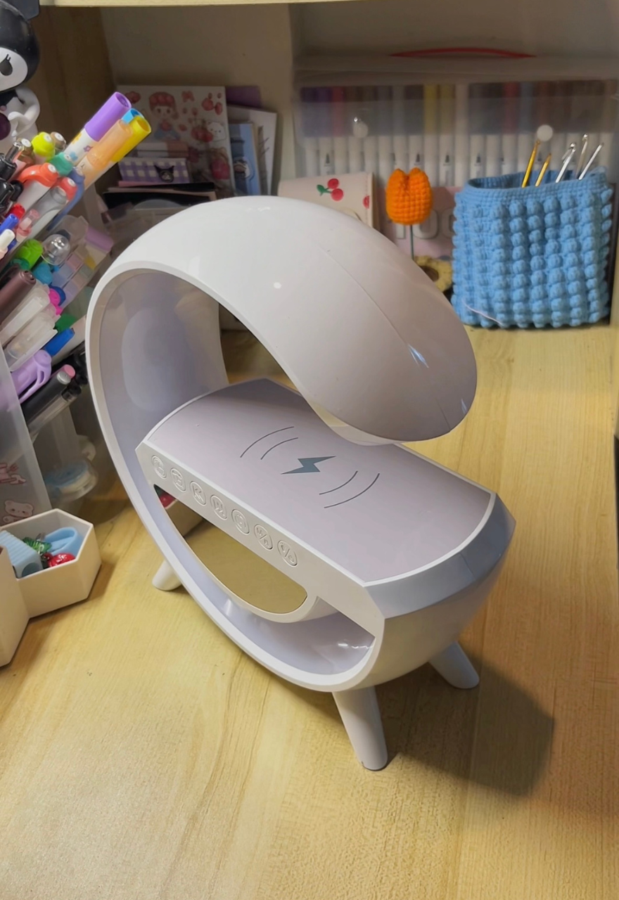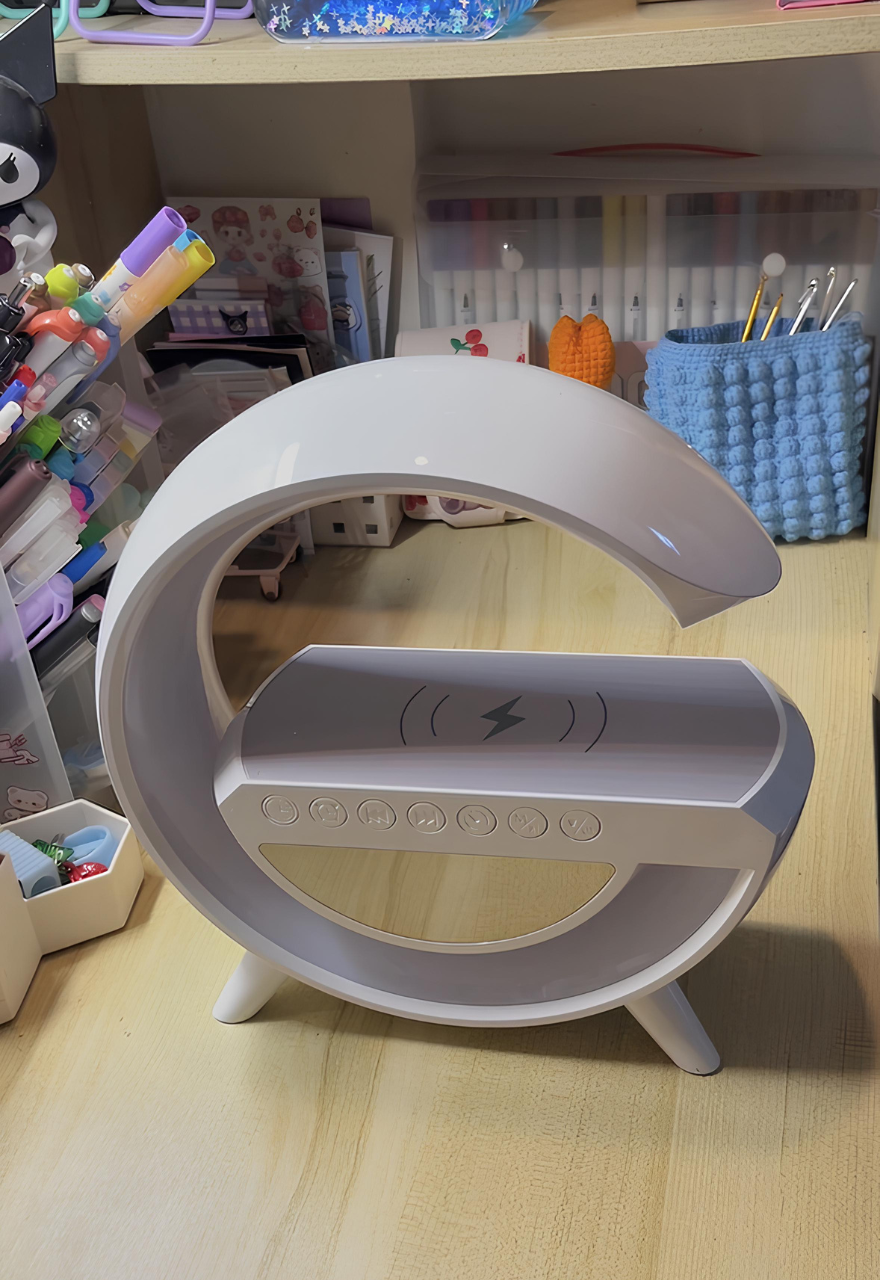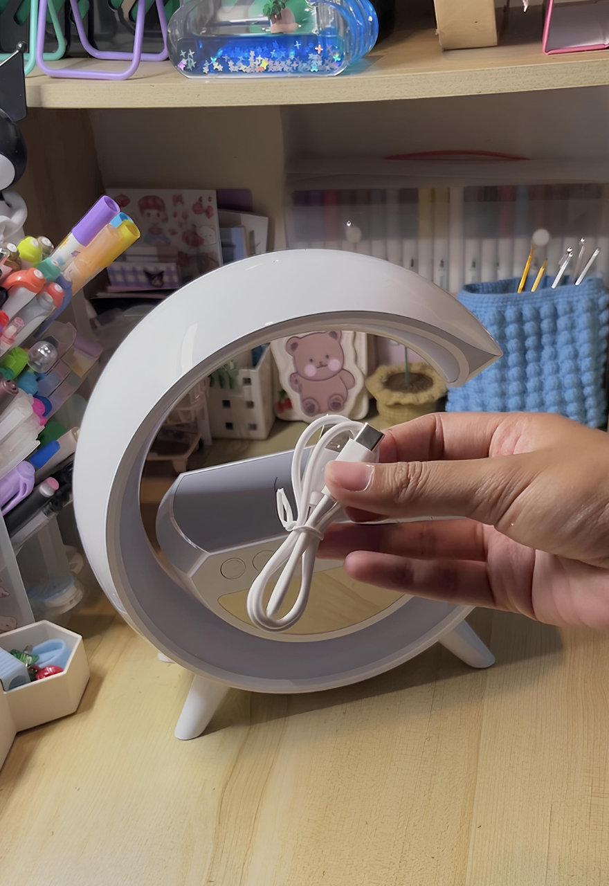 ¡Transforma tu rutina diaria con nuestra luminaria multifuncional en forma de G! Esta luminaria no solo ilumina tu espacio con elegantes luces LED de colores, sino que también funciona como reloj despertador y altavoz Bluetooth para reproducir tu música favorita.