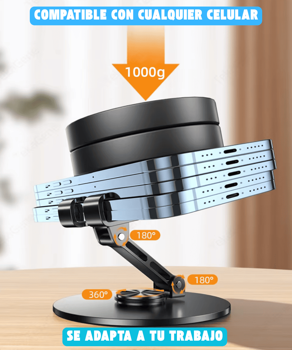 NUESTRO SOPORTE GIRATORIO 360° TE PERMITE AJUSTAR EL ÁNGULO PARA OBTENER LA MEJOR VISUALIZACIÓN, ADEMÁS, SUS ALMOHADILLAS PERMITEN QUE TU DISPOSITIVO MOVIL NO SE CAIGA