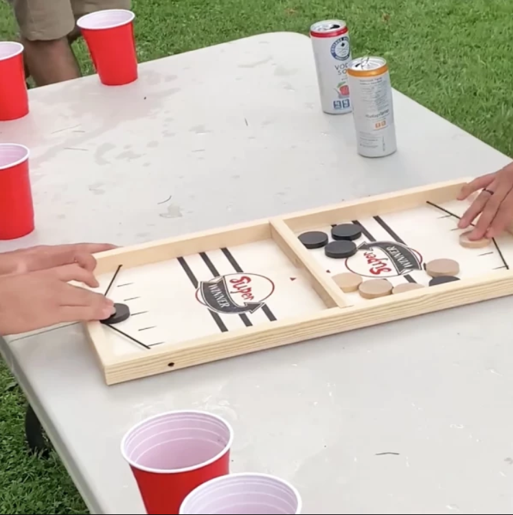 El primer jugador que pase todos los discos gana la ronda de juego de hockey de madera.